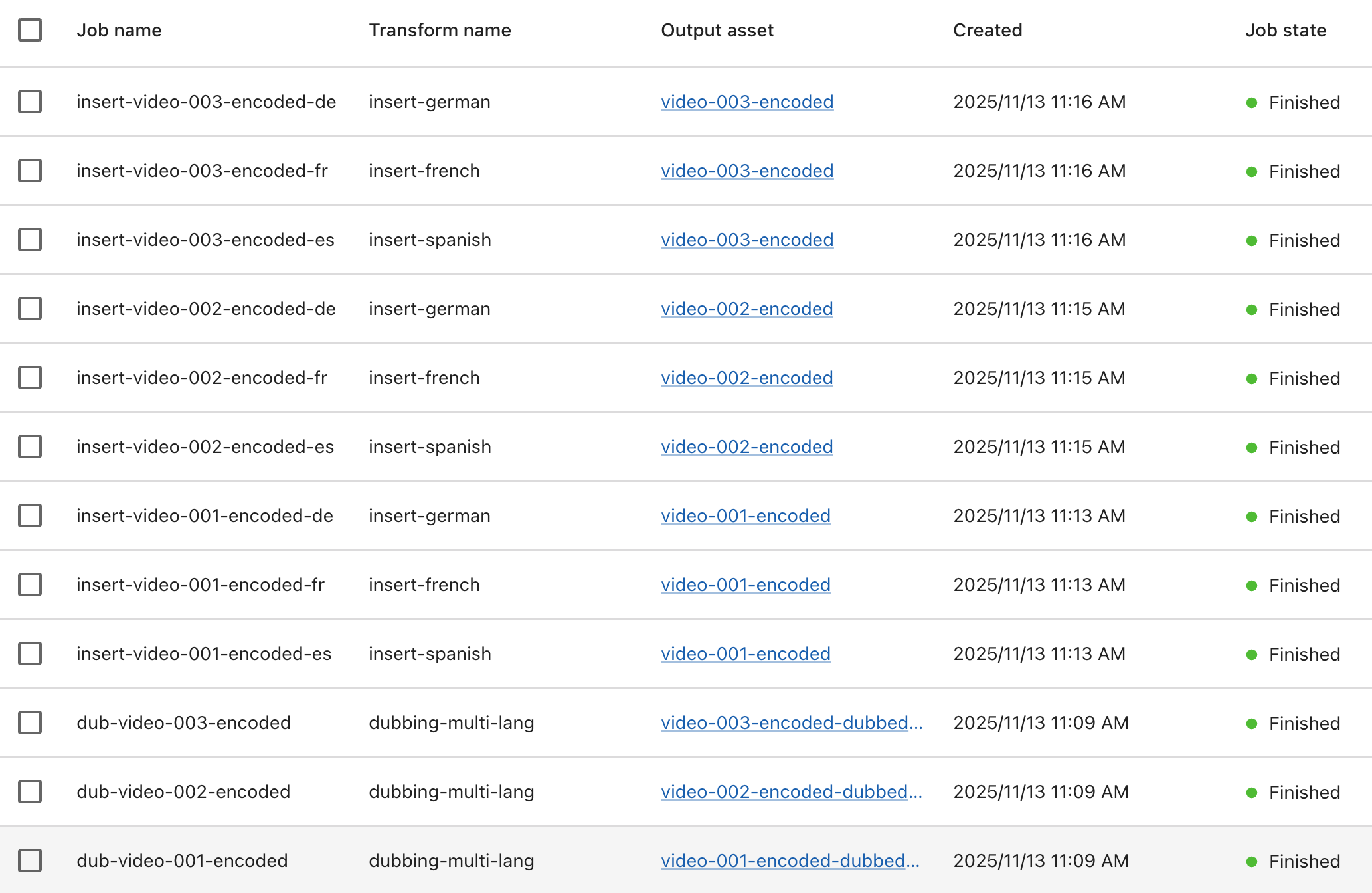 dubbing-multi-lang- The main dubbing transform (English → Spanish, German, French)insert-spanish- Add Spanish audio trackinsert-german- Add German audio trackinsert-french- Add French audio track